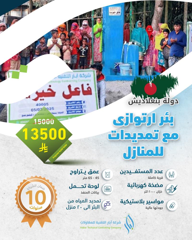احفر بئر ارتوازي مع تمديد لعشرين منزل في بنغلادش بالمناطق النائية و الغير مخدمة بعمق 45 – 65 متر مع شركة آبار التقنية للمقاولات ومن قبل أهم الاختصاصيين الجيولوجيين وبضمان 10 سنوات.
